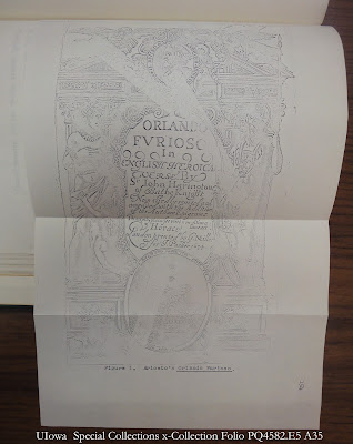 Despite its ostensibly literary orientation, the M.A. thesis is firmly anchored in analytical bibliography. Several books that Mr. Taylor found were not listed in STC or Wing (the old, unrevised editions, which of course he had to use in 1967 -- which leads him to a charming remark that the revised STC was due to be published in only a couple of years, an estimate that was off by about three decades). This leads to the most interesting physical aspect of the M.A. thesis itself: xerox copies of the title-pages of books that he had not seen described or reproduced elsewhere, folded and inserted into an appendix. Below is the reproduction of the Iowa copy of Harington's Orlando Furioso (which I wrote about here, with a better picture using our current digital technology):