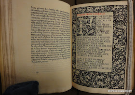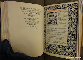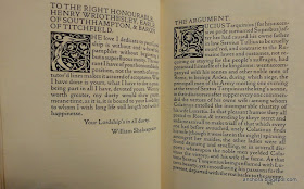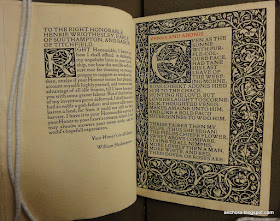 My last post featured our copy of the Kelmscott Press edition of Spenser's Shepheardes Calender. At that time I also looked at another book in the Iowa collection from the famous fine press of William Morris, but it's taken a bit of time, and a bit of digging, to explain its significance. The book's contents are near and dear to me -- and more importantly, central to my work on the early modern book trade -- Shakespeare's poems. Here's the title-page of Morris's 1893 Kelmscott edition of The Poems of William Shakespeare (catalog record here):