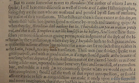 There's a lot happening in this brief passage: first, the point here is to cleverly and ironically mock "all sorts of censurers," those "hastie hot-spurres" who fling "taunting quips" at the learned Greek and Latin historiographers. The author then quotes a few of these commonplace (and, in context, ridiculous and unlearned) quips: "As when they say, Herodotus doth nothing but lie. Thucydides can pen an oration pretily wel, and that is all. Xenophon is not like himselfe in his history." The italics here are a crucial typographical signifier -- as G.K. Hunter showed long ago (in a seminal article in The Library, which if you have access, can be found here) sententiae could be marked in a number of ways, including inverted commas and italics. So, here the italics serve to mark these quips -- mockingly -- as the commonplace utterances of foolish critics.