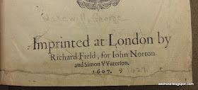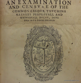 The title-page of the Hakewill book was at some point damaged just below the title (under the final line, and just above the italicized "WHEREOF") whether accidentally, or purposefully -- and it was repaired (quite purposefully) with an entirely different page. The new page shows a large, attractive version of Richard Field's well-known anchor device (I discussed Field briefly here). The motto on the anchor device reads "ANCHORA SPEI" which translates to "anchor of hope" -- a common expression (not to mention shop sign) that could refer to the spare anchor on a ship (the "hope anchor") and which ultimately derives from Paul's epistle to the Hebrews (6:19-20) where he writes of hope as the anchor of the soul. (Field's device is more well-known to non-anchor-loving scholars and book historians as the device which appears on the first printed editions of both of Shakespeare's narrative poems). Field was one of the more skilled printers working in London, and the publishers listed with him in the imprint weren't too shabby, either -- John Norton and Simon Waterson were two of the most important stationers working in the trade at the time.