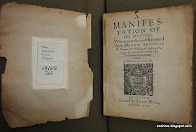 And of course we contemporary scholars are not the only ones who have valued title-pages over time--their value for Shakespeare's contemporaries is clear from the plethora of allusions to the proliferation of title-pages on every available surface around London, a form of advertisement as significant as it was ephemeral, at least from our perspective. There is another way to see how valuable title-pages once were, though, and it's a form of material evidence that, until our STC survey, I had rarely, if ever, experienced first-hand. The title-page was very often not the first page of the book; many books, especially smaller pamphlets (which may not have been bound immediately, or even intended to be bound at all) included a blank leaf which served to protect the precious title-page. We have six such pamphlets here at Iowa, all of which are clearly and unmistakably marked with a prominent signature: A1r. Here's one example, a pamphlet by John Hayward (who I wrote about previously here):