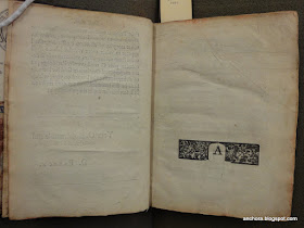 The ornament surrounding the "A" is exactly the same as the example above--and it presumably belonged to John Bill, the printer of both of these pamphlets.