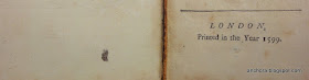 Here we have Sonnets To Sundry Notes of Musicke, attributed to "Mr. William Shakespeare," with the imprint claiming it was "Printed in the Year 1599" in London. You may even be able to tell -- quite quickly -- from this image that this book was certainly not printed in 1599. (In person, it was clear to me right away that this was a false imprint, due to the type and, to a lesser extent, the paper quality). The title is a familiar one, because it derives from The Passionate Pilgrime -- both the 1599 and the 1612 editions include an interlinear title-page with the same title (even though, in both cases, the title-page and the section that follows are both integral to the volume):