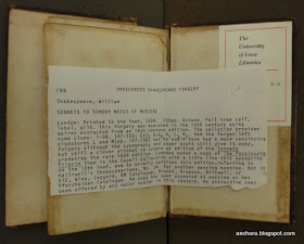 According to the note, this volume is an "unrecorded" eighteenth-century forgery. The note says that the volume consists of quires from some eighteenth-century edition of the poems; the Sundry Notes page has been moved to the front in "a clever attempt to create an edition of the Sonnets predating the rare 1609 edition." The note cites a couple of (very brief) mentions of this volume (the Lowndes is here, while the listing in Halliwell's Shakespeariana is here), but otherwise leaves it at that, saying only that "No copy has ever appeared at auction" and concluding with the simple statement that it is "An attractive copy."