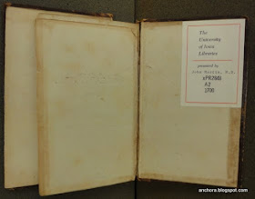 The librarians tell me that around one hundred books from the collection of John Martin are housed in Special Collections -- but over three thousand of his books form the core of the collection of the fantastic John Martin Rare Book Room in the Hardin Health Sciences Library here at Iowa (it's a fantastic resource of the history of medicine, with a sterling early modern collection -- click here for a brief bio of Dr. Martin). There is no evidence of where or when Dr. Martin bought this book, which is really too bad, because it's a gem. The call number intrigued me before I even saw the book -- it's catalogued as a book from 1700 (here's the InfoHawk record) -- but there was no edition of Shakespeare's poetry published in 1700. Starting with the First Folio in 1623, the poems and sonnets were excluded from collected editions of Shakespeare's works, until Malone finally reintegrated the corpus late in the eighteenth century. There were editions of the poems published, though, often as "unofficial" extra volumes to multi-volume editions of the plays -- but again, the first multi-volume edition wasn't published until 1709.