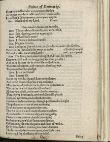 Since those 22 lines are missing in both the Q1 and F1 texts -- both of which (especially the former) are often thought to reflect some elements of theatrical performance -- the lines are usually characterized as a cut, either as a way to avoid angering the newly crowned King James (whose wife happened to be from Denmark), or, perhaps more convincingly, as a way to stop Hamlet from once again slowing down the action with another long speech. The important thing for my purposes here, though, is that the crucial phrase is generally the same in all three texts. Here's the F1 and Q1 versions: