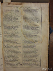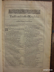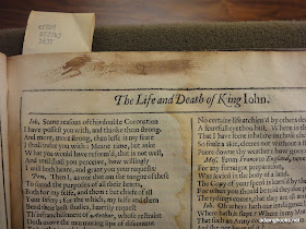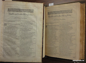 This is the first page of King John, which happens to be the first play in the section of "Histories" in the folio. This particular page comes from the Second Folio, and it happens to be in the Iowa Special Collections library (catalog record here). But it is not a part of our copy of the Second Folio -- not because of any overzealous student, though. This slim little volume consists only of the pages of King John from some copy of the Second Folio, pages that at some point were removed and sold on their own. It's not all of Shakespeare; it's just a piece of Shakespeare -- a relic, and a relic that would happen to be far more affordable than, say, an entire folio. So here are our two copies of King John, side by side:
