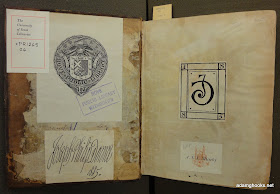 Here you can see the Iowa library call number, which has been pasted over another (and far more attractive) library bookplate, that of the Hove Public Library, which is stamped "withdrawn." (Hove is right next to a more well-known British coastal town, Brighton, which is due south of London). On the lower right is the bookplate of A. N. L. Munby, the famous twentieth-century Cambridge bibliographer (about which more, below). And on the lower left, there is the signature of the intriguingly-named Joseph Philip Donne, along with the date (1885). I'm guessing the bookplate on the upper right may be Donne's, since it looks like a stylized monogram of his initials, JPD. Pasted on the back board of the binding is one final mark: