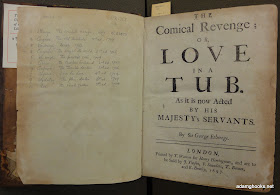 As you can see, some of these plays are by quite well-known authors, including Etherege, Congreve, Cibber, and Wycherly. A similar list has been written in pencil opposite the title-page of the first play in the collection, Etherege's fantastically-titled The Comical Revenge; or Love in a Tub.