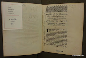 This was a report of a speech given by Rous (as his name is usually spelled) at the trial of John Cosin (who Rous accused of being a papist, naturally). Rous was an active member of parliament, not to mention the stepbrother of the famous John Pym, and he would be an avid supporter of Cromwell in the civil war. (He also appears to have been the one to author the injunction closing the theatres in 1641). This is another single-sheet pamphlet, which also relates events from the parliamentary crisis leading up to the civil war. While it doesn't directly relate to the trial of Laud, it does evince a clear anti-Laudian bias, and so it's not surprising this was bound with the previous pamphlet (and the volume probably included many more pamphlets on the same or similar topics, as well).