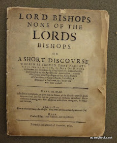 We have several pamphlets and newsbooks from the era of the English Civil War, which is unsurprising, considering the explosion of printed pamphlets in the late 1630s and, especially, in the 1640s, after the collapse of the licensing regime. This wonderfully-titled pamphlet, Lord Bishops none of the Lords Bishops, is not a civil war pamphlet, but rather a product of the so-called Bishops' War between England and Scotland, a conflict precipitated by Charles I's attempt to reform the Scottish church. This is one of the more substantial pamphlets in the collection, as you can see from this image: