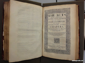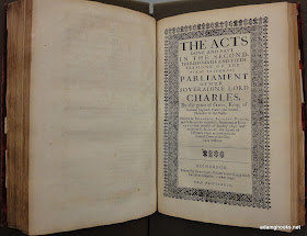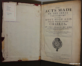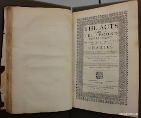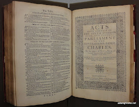 This is the red velvet binding to a group of Acts of Parliament published over the last decade and a half, or so, of the life (if not quite reign) of King Charles I. In the Iowa library, the entire volume is given a single call number (catalog record