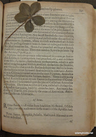 In the image directly above, I've shifted the flower so that you can read the full text -- which does mention the preponderance of laurel trees in "Antiochia," as it is called. Again, I'm no botanist, but those are not leaves from the laurel trees, and laurel flowers are cupped and white. (If anyone has any ideas what plant this comes from, I'd love to know). So we can just enjoy this as a particularly charming use of a book.