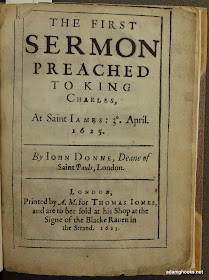 Here the text is prefaced with Donne's body, heightening the identification between author and work (or text) -- indeed, it is an act of conservation and consecration, preserving the memory and the presence of "the late Learned and Reverend Divine, John Donne, Dr. in Divinity and Deane of S. Pauls, London" as the title-page states. Part of Kastan's point was to show that as a preacher, Donne was familiar as a published author -- his sermons are clearly attributed to him, as you can see from this example from Iowa's Special Collections library, which just happens to have a copy of a Donne sermon: