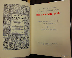 The introductory essay, on the history of the Coverdale bible, is lengthy by leaf book standards, and an appendix adds to the heft (and usefulness) of the volume by providing a census of copies in the U.S., Canada, and the U.K. No doubt one of the motivations for including this extra (and insistently scholarly) material is both to justify the existence of the book, and to separate it from the relatively slight essays that were often included in previous leaf books.