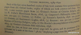 Madan's selections suggest that the Oxford printing trade in this era could be represented by a theological work in English (Ursinus), a text on logic in Latin (Sanderson), and a treatise on the value of proverbs in Latin (Reusner). (The Fuller and Carpenter books also fit this general model). This is perhaps unsurprising--the Oxford trade would naturally cater to a primarily academic audience, focusing on popular or useful works which would need to be reprinted on a regular basis, while relying on the import trade, from both London and the Continent, for books which were less popular, less in-demand, less useful, or simply extra-curricular.