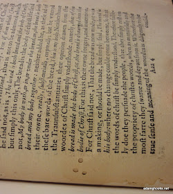 The third Iowa copy also has a leaf from the Ursinus, but from much earlier in the book: this leaf is from the preamble, which is to be expected, since this is copy #27 of Madan's book. We can presumably guess that they worked their way systematically through a copy of Ursinus--but the bookworm apparently didn't care for the prefatory material, because there is no sign of damage here: